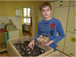 Eine gute Pilzsaison neigt sich dem Ende. Schade, denken sich alle Pilzsucher. Doch wir verlängern die Saison und bestellten eine Pilzbox zum „Selberzüchten“. Helena, Sophie und Yannick bereiteten das Substrat und den Nährboden zu. Durch regelmäßiges Gießen wird das Wachstum gefördert. Der „eigentliche“ Pilz lebt als Geflecht im Boden. Für unser Auge unsichtbar, haben die Pilze eine wichtige Rolle im Kreislauf der Natur. Sie helfen beim Zersetzen des organischen Materials im Wald oder auf Wiesen. Da wir gerade im Biologieunterricht die Lebensvorgänge im Wald betrachten, werden wir dieses Projekt in den nächsten Wochen begleiten. Zeigen sich die Fortpflanzungskörper, geht es ans Ernten. Champignons sind leckere Speisepilze und gesund. Wer Pilze kaufen möchte, meldet sich bei uns. Garantiert Bio und super frisch!