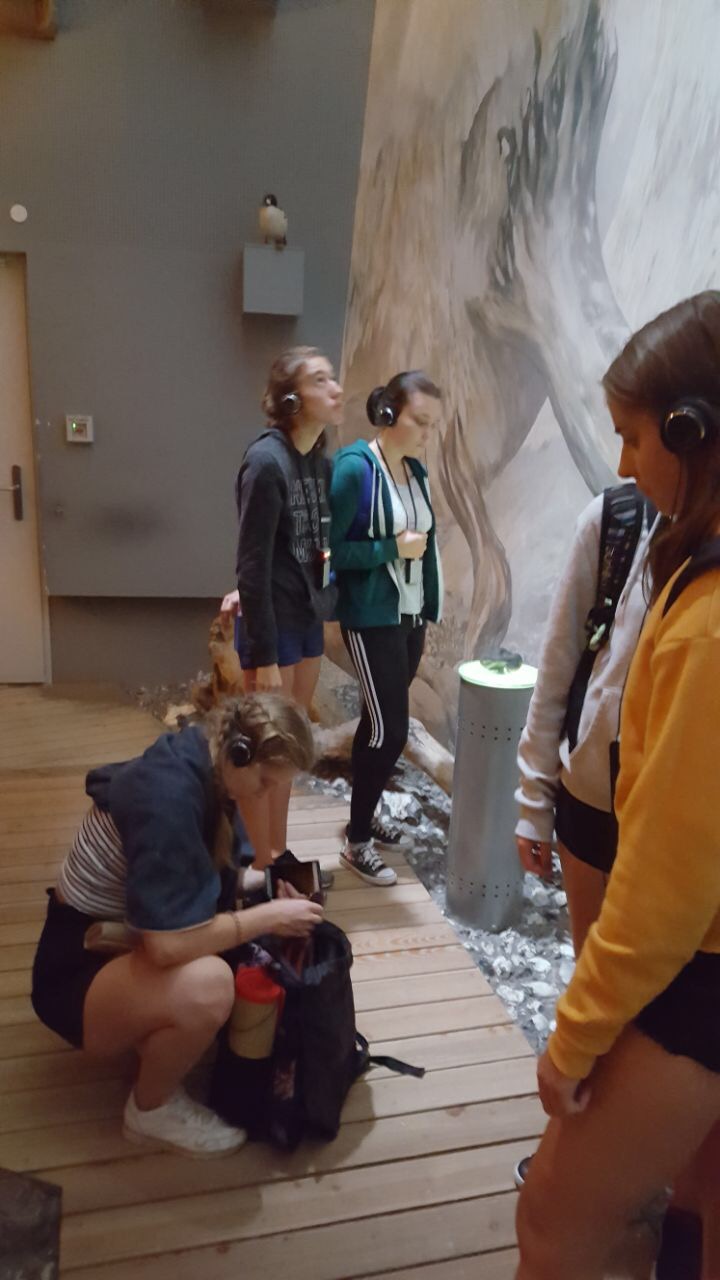 Jeder von uns bekam einen Audioguide und konnte sich eine von vier Touren auswählen: Romantik, Neugierde, Abenteuer und ein spezielles Angebot für Kinder. Die meisten entschieden sich für den Abenteuerrundgang. Aber auch die Romantik und die Neugierde wurden genommen. Im Mittelpunkt standen verschiedene Themenbereiche: zur Kreide, vom Wald, vom Wasser und von der Wildnis, im Wandel der Zeit betrachtet. Darum passte für uns das Zitat “ Die Zeit schreibt ihre Spuren in den Sand “ sehr gut.