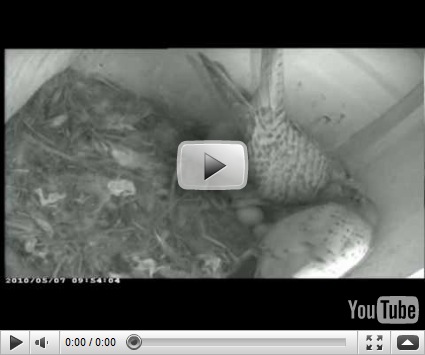 Wie bereits vermerkt, hat ein Dohlen-Paar den Kampf um das Falkennest gewonnen und bereits 4 Eier gelegt. So weit – so gut. Als in der letzten Woche die ersten Kamerabilder vorlagen, saß aber keine Dohle auf den Eiern, sondern ein Falke. Das Falkenweibchen legte noch einmal 4 Eier dazu und begann mit dem Brüten. Nun wird es sehr interessant, was aus den Dohleneiern wird.