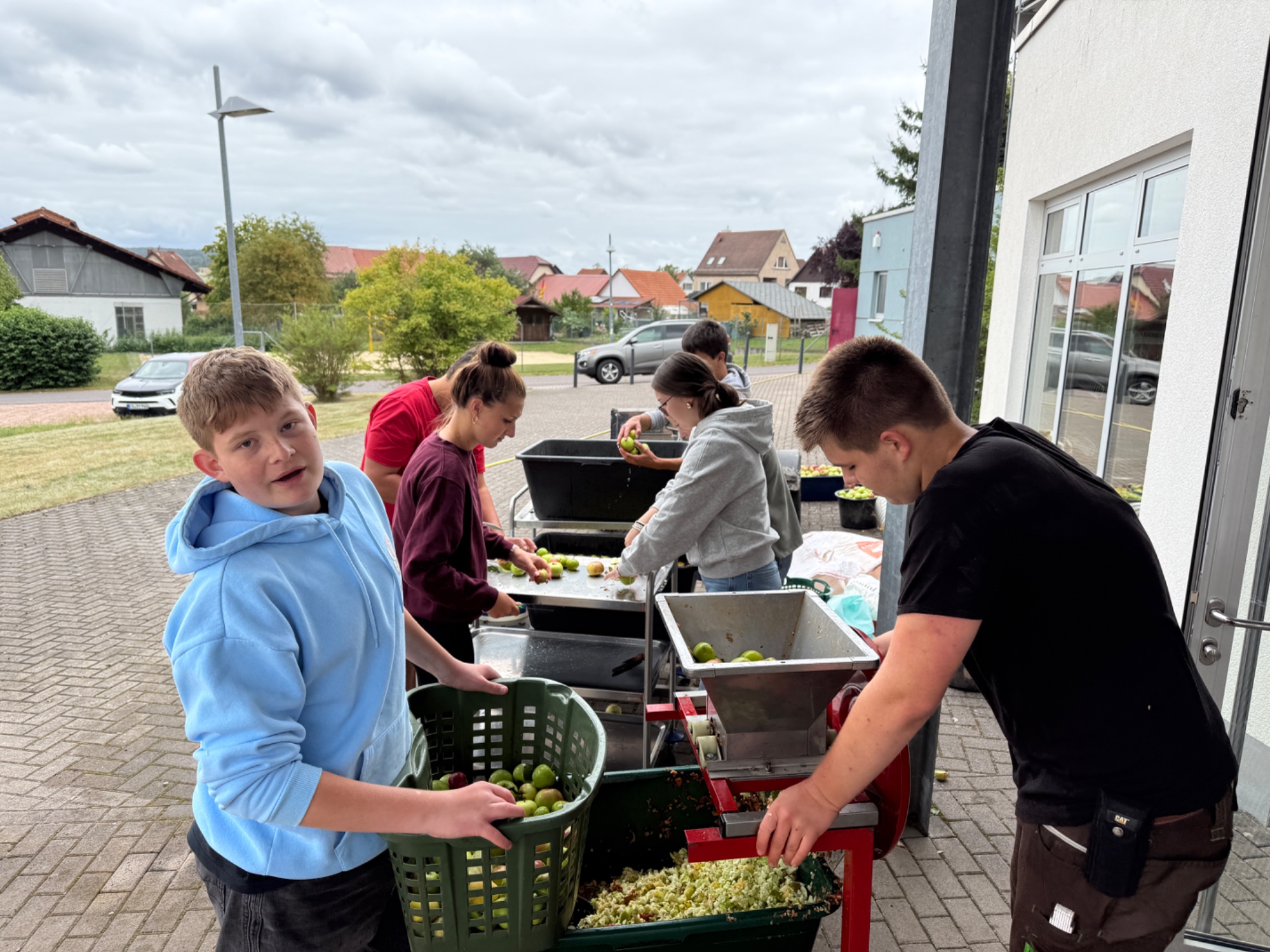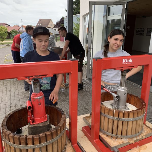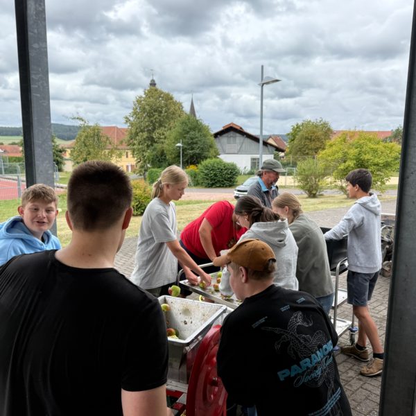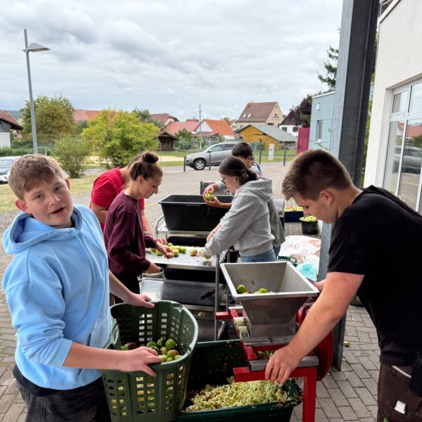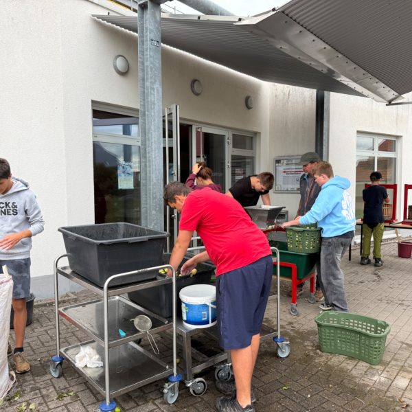 Es geht wieder los. Den Anfang haben die Schüler und Schülerinnen aus der Klasse 9b gemacht. Am Freitag, den 23.08.25 wurde fleißig gearbeitet, damit der Apfelsaft nur so fließen konnte. In der Küche wurde geschnippelt, Teig gerührt und Apfelmus gekocht. Am Ende waren ein Apfelkuchen, Apfelmuffins und Eierkuchen und Apfelmus zum gemeinsamen Verzehr bereit. Und es kamen 57 3-Literpacks zusammen. Eine beachtliche Leistung von gerade einmal 12 Schülern und Schülerinnen und 2 Lehrern. Ein großes Dankeschön an alle Apfelpflücker und Sammler und Fahrer und besonders Herrn Fibich. Es hat wie immer Riesen Spaß gemacht!