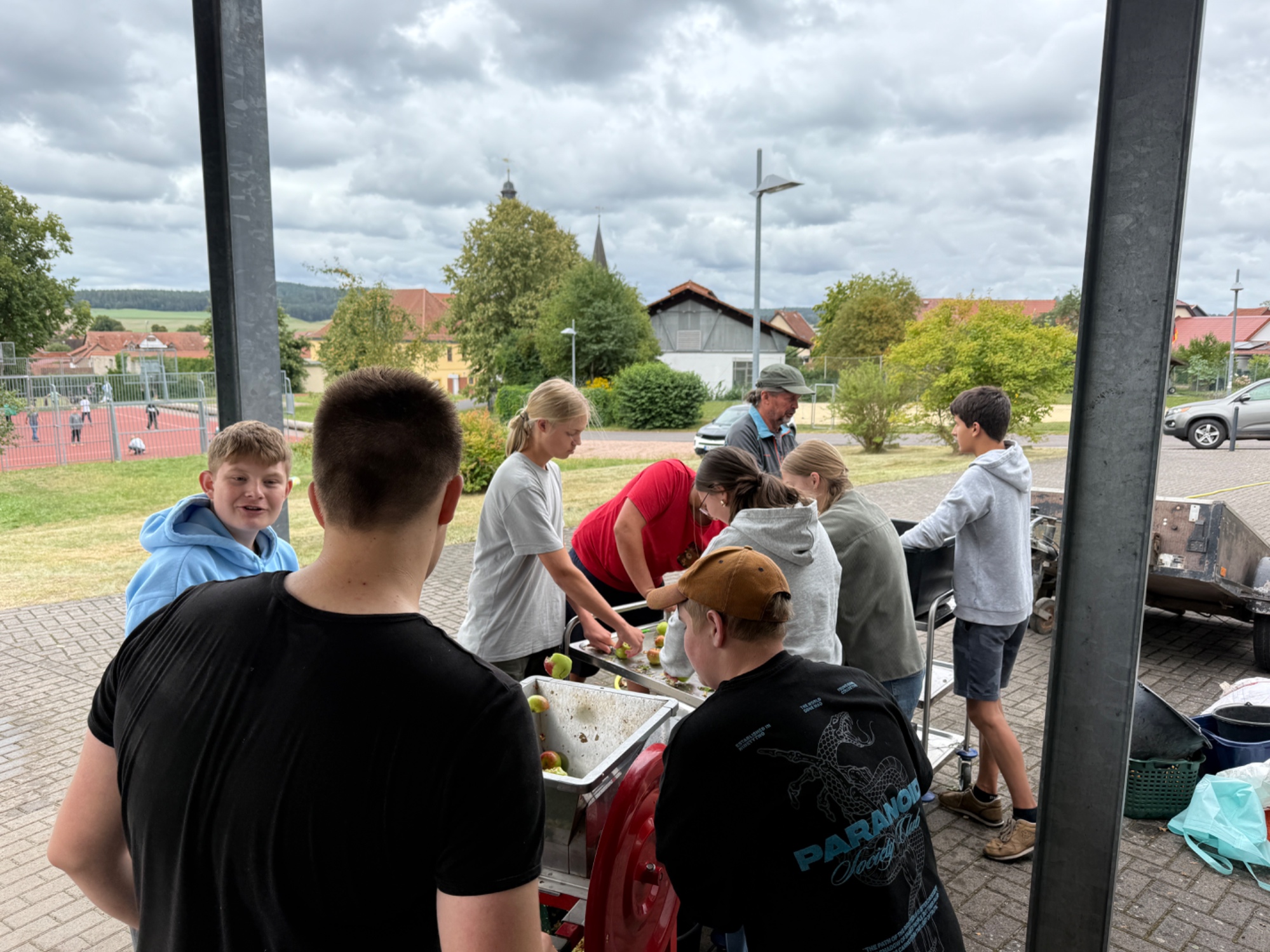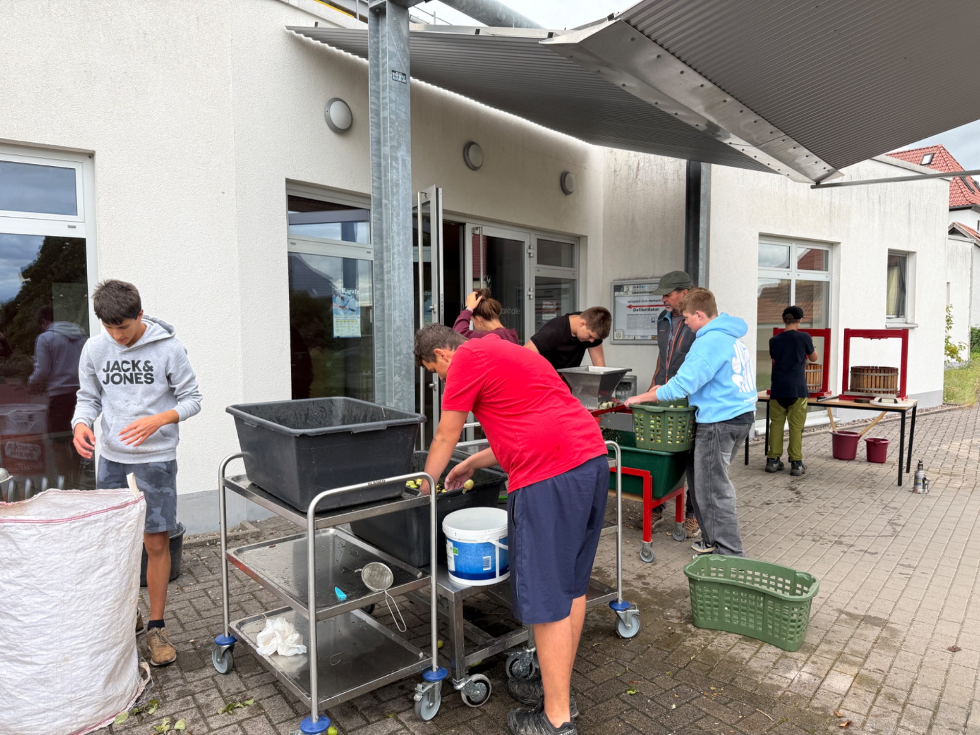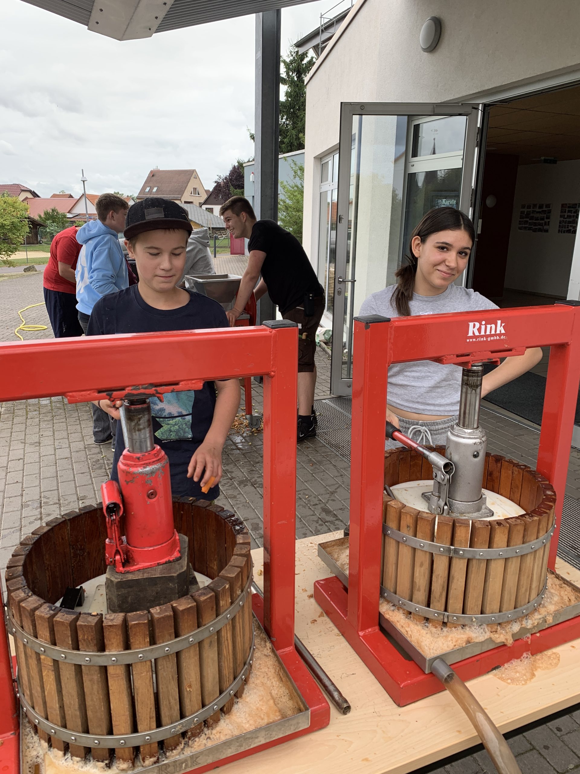 Es geht wieder los. Den Anfang haben die Schüler und Schülerinnen aus der Klasse 9b gemacht. Am Freitag, den 23.08.25 wurde fleißig gearbeitet, damit der Apfelsaft nur so fließen konnte. In der Küche wurde geschnippelt, Teig gerührt und Apfelmus gekocht. Am Ende waren ein Apfelkuchen, Apfelmuffins und Eierkuchen und Apfelmus zum gemeinsamen Verzehr bereit. Und es kamen 57 3-Literpacks zusammen. Eine beachtliche Leistung von gerade einmal 12 Schülern und Schülerinnen und 2 Lehrern. Ein großes Dankeschön an alle Apfelpflücker und Sammler und Fahrer und besonders Herrn Fibich. Es hat wie immer Riesen Spaß gemacht!