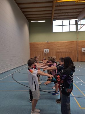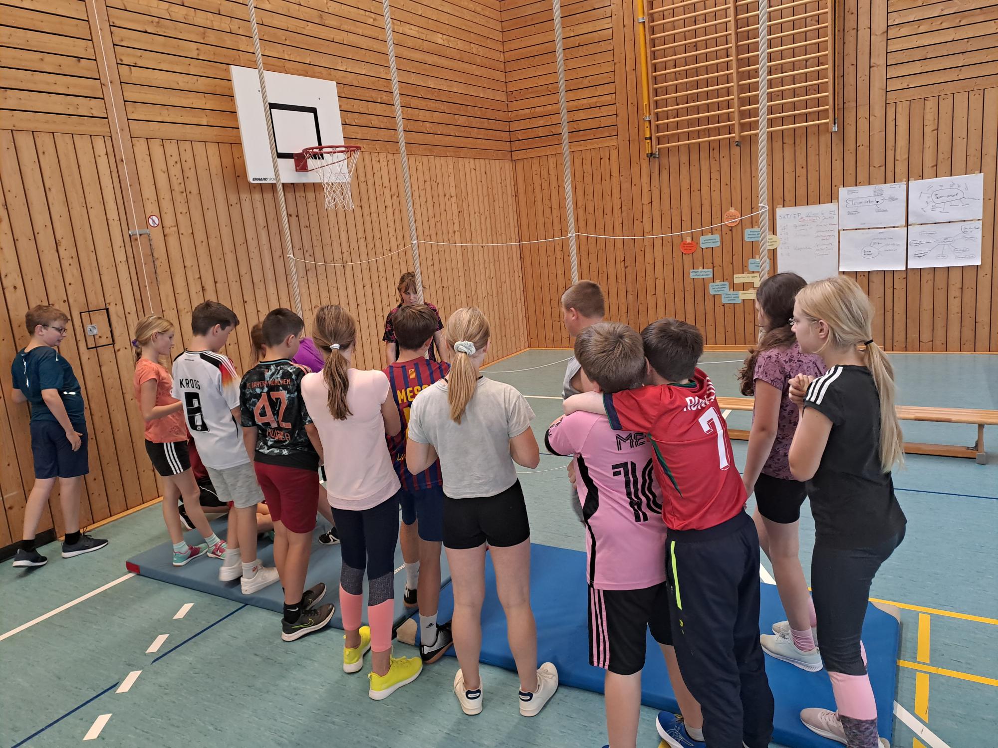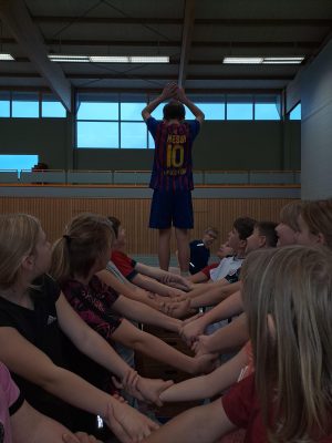Mit dem Thema „Teamarbeit- Was bedeutet gelingende Arbeit als Team“ beschäftigte sich im diesjährigen Sozialkompetenztraining die Klassenstufe 6. Die Basiselemente Vertrauen und Kooperation wurden nach einem intensiven Warming Up mit dem Spiel „Hühnerball“ durch Kleingruppen und mit Hilfe eines Mindmaps herausgearbeitet. Danach ging es an die vertrauensfördernden Aktionen „Vertrauenslauf“ sowie „Vertrauenssprung“. Kooperatives Geschick und gute Teamarbeit mussten dann im „Spinnennetz“ sowie in der abschließenden „Flugshow“ unter Beweis gestellt werden. Besonders hervorzuheben war dabei der (inter-) aktive Austausch nach den einzelnen Aktionen durch die Klasse, um kommunikative und strategische Prozesse zu festigen sowie gemeinsame Erfahrungen zu reflektieren. Max als Klassensprecher befand daher im abschließenden Feedback als besonders hervorzuheben, dass „wir verschiedene Aufgaben bekommen und das wir uns nach der (jeweiligen) Aufgabe nochmal besprochen haben“.