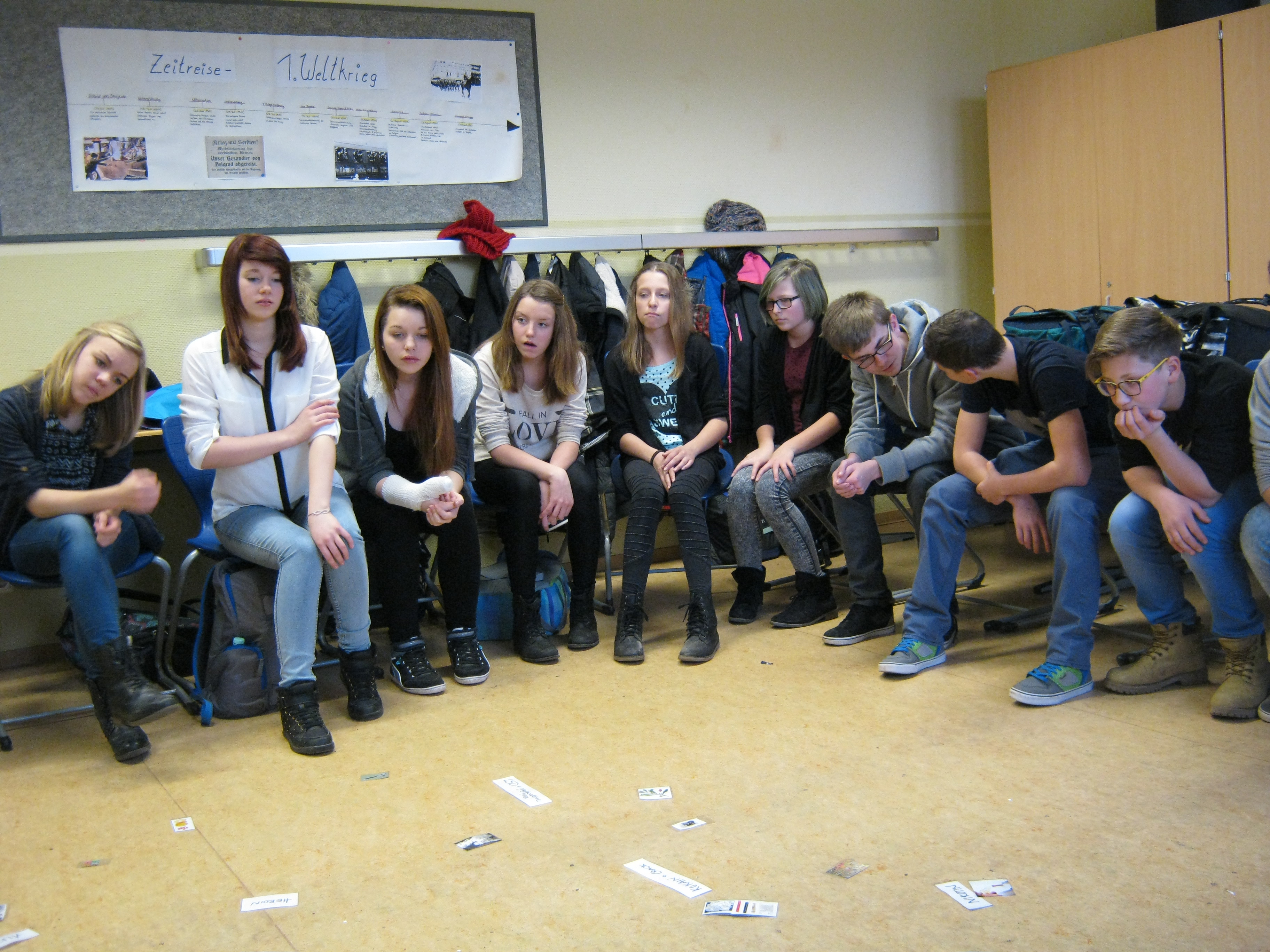Aber nicht nur theoretisch wurde gearbeitet und diskutiert, sondern mit dem Drogenquiz und der Mauer gegen Sucht praktische Anteile für die Schülerinnen und Schüler geschaffen. So konnten alternative Möglichkeiten für das eigene Handeln und Verhalten aufgezeigt werden. Mal eine andere Form des fächerübergreifenden Unterrichts, der allen Beteiligten ein sehr interessantes und positives Feedback entlockte. Vielen Dank an dieser Stelle noch mal für unsere Referentin Frau Luther.