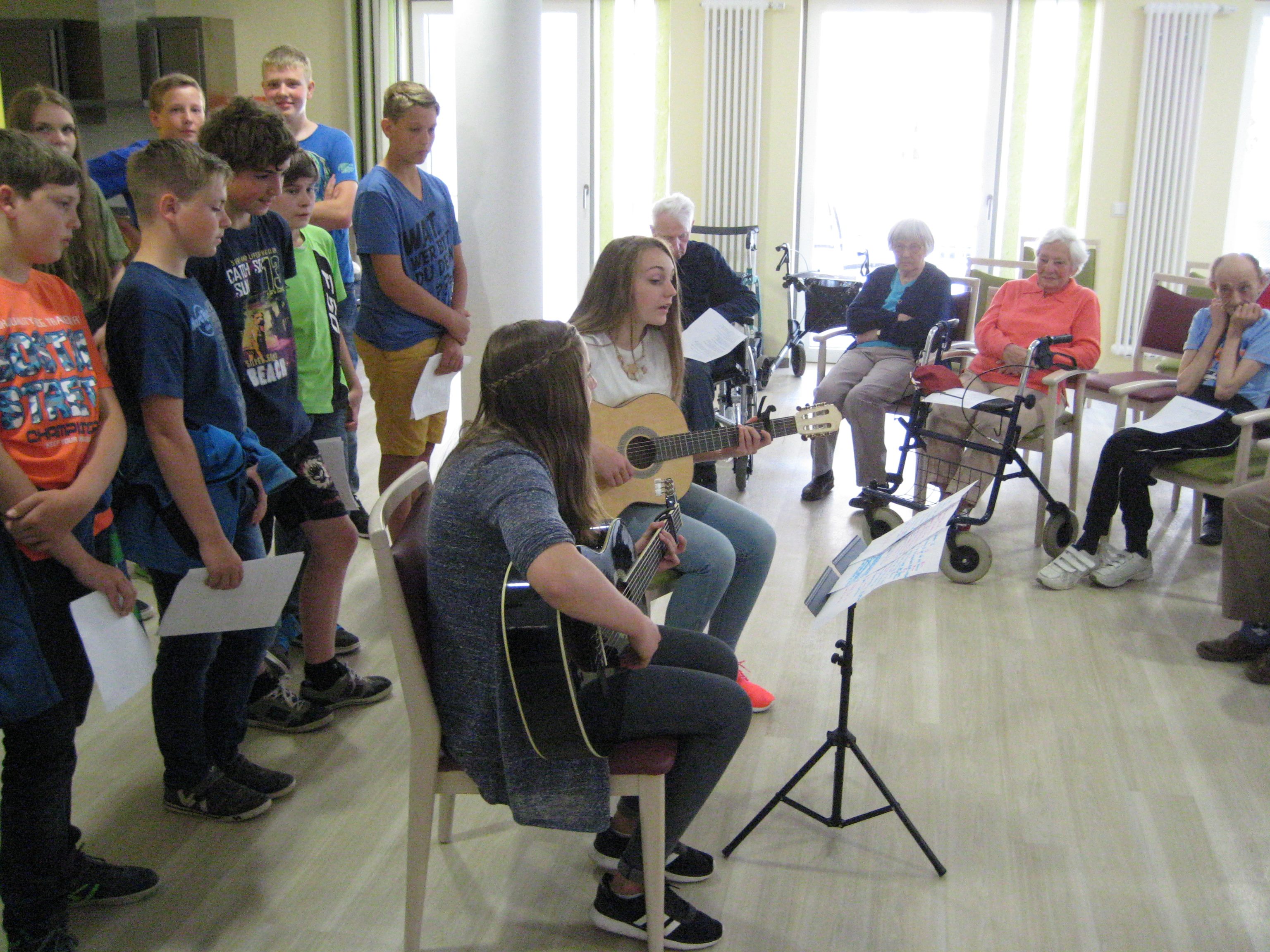 Die Klasse 7a verlegte am 22.05.15 den Musikunterricht vom Klassenzimmer in das neu eröffnete Wohn- und Pflegezentrum Marksuhl. Nach einer Begrüßung durch Frau Heß überreichten die Schüler Geschenke, die sie im Werkunterricht hergestellt hatten. Es folgte ein kleines musikalisches Programm; Lieder wie „Veronika, der Lenz ist da“ wurden dabei mit etwa 25 Bewohnern des Pflegezentrums gemeinsam gesungen. Aktuelle Songs, mit der Gitarre von Tino und Robin begleitet oder von Jasmin und Luisa alleine vorgetragen, ergänzten die Aufführung. Über die gelungene Musikeinlage freuten sich die Senioren und die Leiterin Frau Reukauf bedankte sich für die Überraschung. Die Reaktionen der Schüler auf diesen kurzen Abstecher waren sehr positiv – dieses Projekt soll deshalb in Zukunft auch mit anderen Klassen im Werk- und Musikunterricht fortgeführt werden.