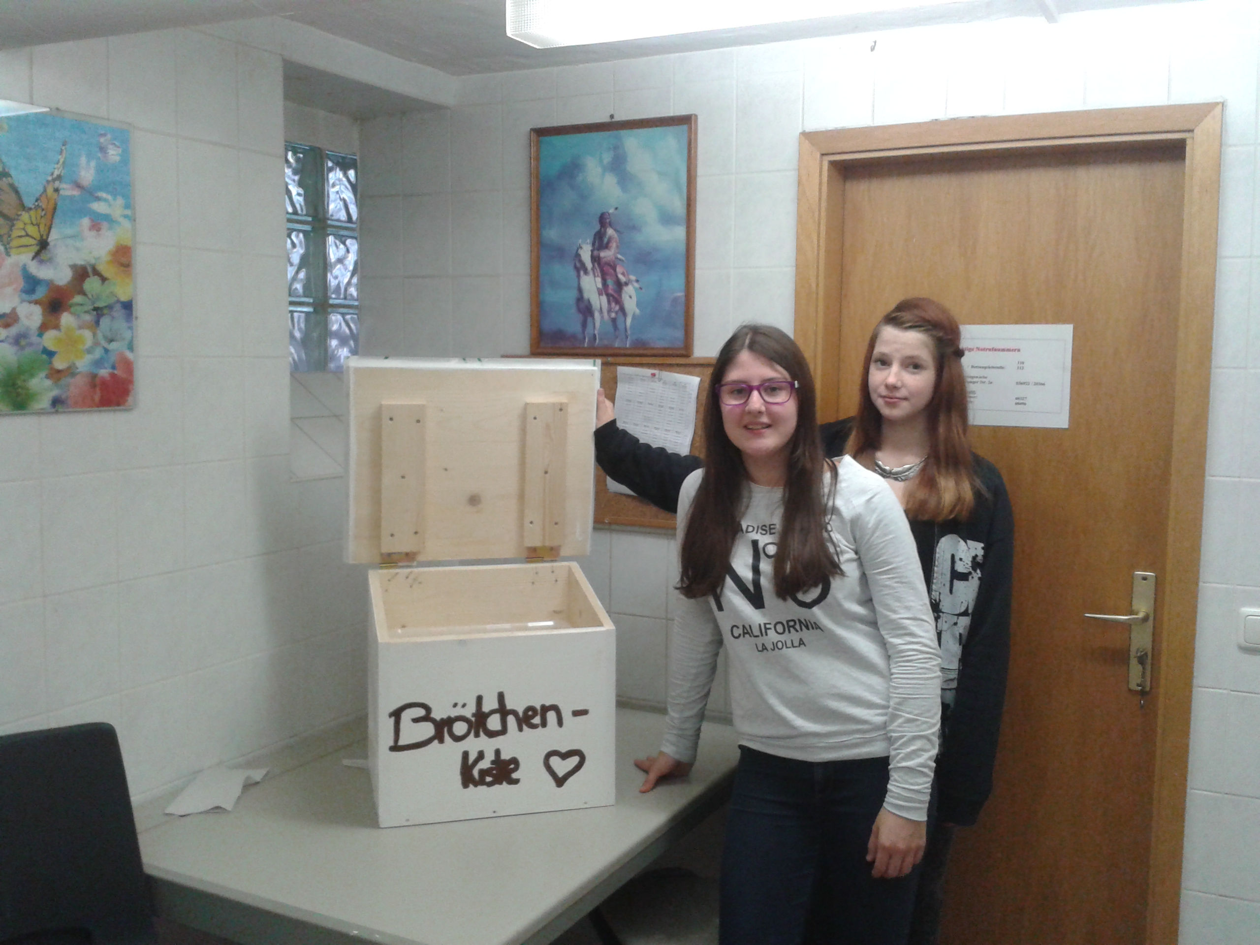 Bevor die kalte Jahreszeit an der Schlossparkschule einkehrt und um die hygienischen Grundbedingungen zu gewährleisten, machte sich die Pausensnack Crew unter dankbarer Mithilfe unseres Hausmeisters daran, eine Brötchenbox zu konstruieren und herzustellen. Die Box besteht aus witterungsbeständigem Holz, welches mit einem Anstrich versehen wurde. Um die Brötchen hygienisch zu lagern, befindet sich in der Holzkiste eine Plastebox. Dort hinein können die Brötchen vom Lieferanten auch in den kalten Morgenstunden sicher und vor Allem trocken gelagert werden. Somit sind frische und trockene Brötchen auch ab der Herbstzeit in der Schülerfirma „Pausensnack“ garantiert. 😉