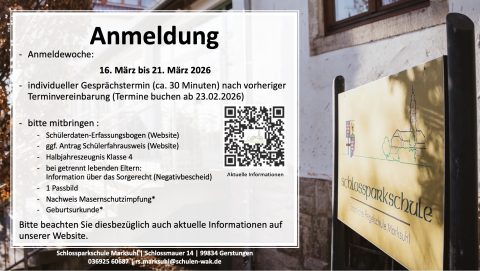 Sehr geehrte Eltern und Erziehungsberechtigte, in diesem Beitrag finden Sie alle wichtigen Dokumente zur Schulanmeldung für das Schuljahr 2026/2027. Ab sofort können Sie unter dem folgenden Link https://doodle.com/group-poll/participate/dwyRByma einen Termin zum Anmeldegespräch buchen. Bitte erscheinen Sie zu diesem pünktlich … Read More